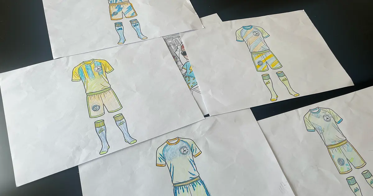 Mateo came home from Tekkers soccer camp with a homework challenge. His team needed to design a new kit for Teaching Tekkers, a real coaching organisation in Dublin. Best design won team points. He is competitive.